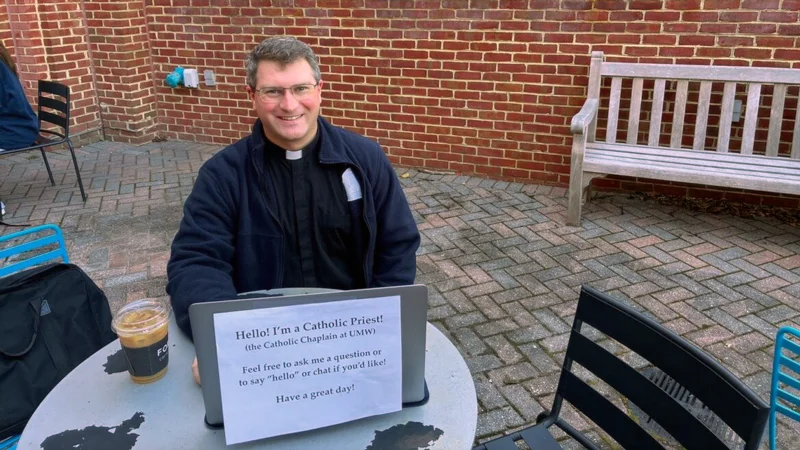 Tal como puede verse en la foto de portada, este sacerdote hace lo que sea necesario por llevar almas a Cristo. “¡Hola! ¡Soy un sacerdote católico!”, es el saludo explícito del letrero pegado en la parte posterior de la computadora portátil del padre Richard Miserendino, capellán de la pastoral católica en la Universidad de Mary Washington y sacerdote de la Diócesis de Arlington, Virginia.